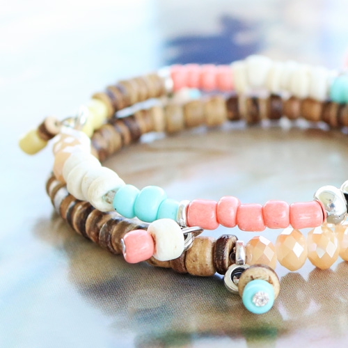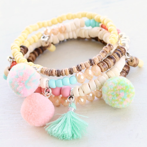 Caribbean vibes! These coconut beads in combination with colourful beads and charms, like glass seed beads and tassels, look perfect in this Caribbean set. The bracelets are threaded on elastic cord. The base is made of coconut beads and we’ve added glass seed beads and faceted beads as well. In between the beads we threaded some pendants with eye. To these eyes we added some tassels, pompoms and we also made some charms of coconut beads and seed beads onto a headpin!