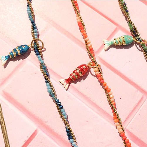 This new collection features colourful necklaces with sparkling faceted beads and stainless steel heart earrings with enamel details. Two separate eye-catchers that look great together or individually. Ready-to-wear, sparkling, and perfect for mixing & matching.