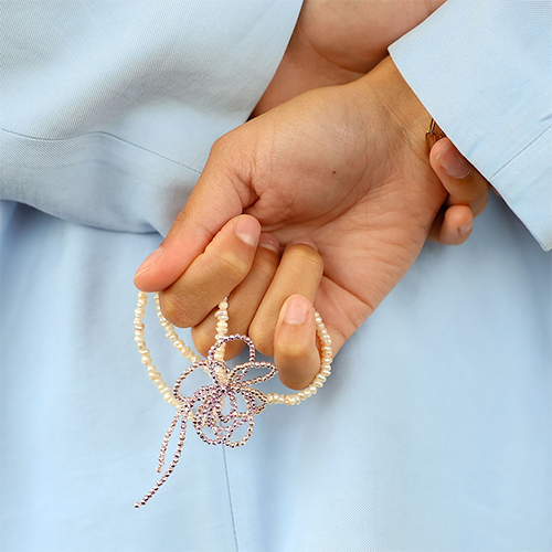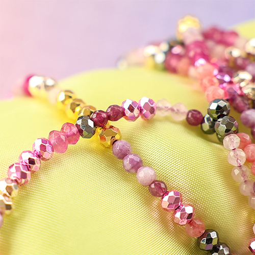 This new collection of Top faceted beads has a stunning metallic look and comes in sparkling colours like pink, purple, blue, and silver with a futuristic vibe. Combine them with pearls, belcher chain, and nylon cord to create layered designs or an eye-catching flower or bow shape. These beads are real eye-catchers!