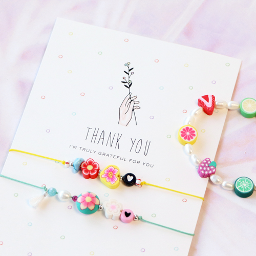 The new polymer beads are perfect to create fun jewellery. These beads can be combined endlessly with a lot of beads and stringing materials. For the bracelets, we have used a macramé bead cord. Then we threaded a combination of polymer beads, acrylic beads, chips stone beads and tassels onto a wire. Do you want the beads to stay in place? Make a knot on both sides. Create matching cute rings by alternating polymer beads with glass seed beads on nylon wire. Moreover, you can also use the polymer beads and the nylon wire to make a nice sunglass cord in combination with various beads. Attach the end of the wire to the glasses cord ends with a crimp bead and your colourful glasses accessory is ready! Let the sun shine!