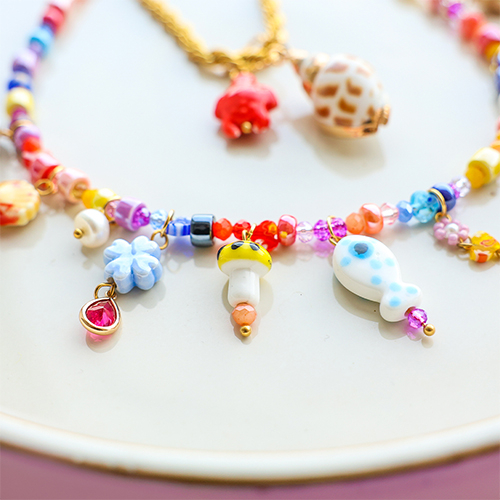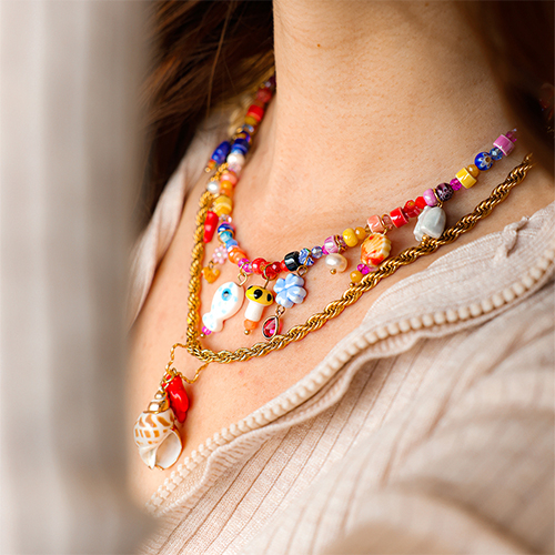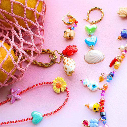 Discover our new cheerful collection of ceramic beads. Available in colourful shapes like elephant, turtle, mushroom, heart, and shell. Combine the beads with facet, trendy cord, millefiori, and natural shell charms for beautiful necklaces and cheerful earrings.