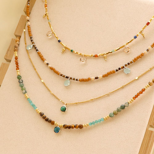 Crystal glass pendants are ideal for creating necklaces that can be combined with each other. Thread various beads such as faceted natural stone beads, cat eye beads, DQ metal beads and gold coloured Miyuki seed beads. Choose different crystal charms and attach them to the chains with a jump ring. To do this, create link chains to which you attach pendants in matching colours and combine the chains into sets.