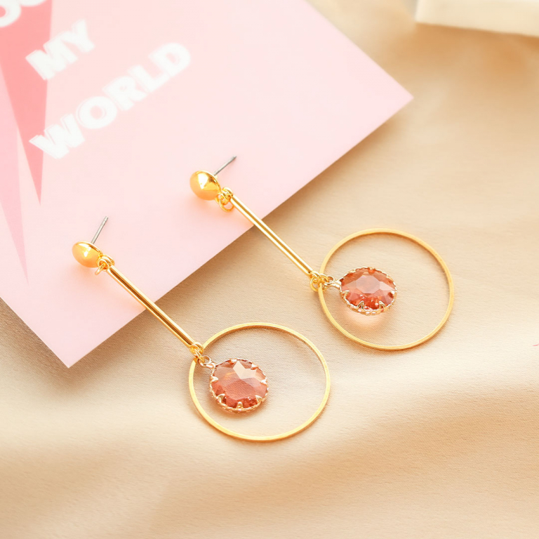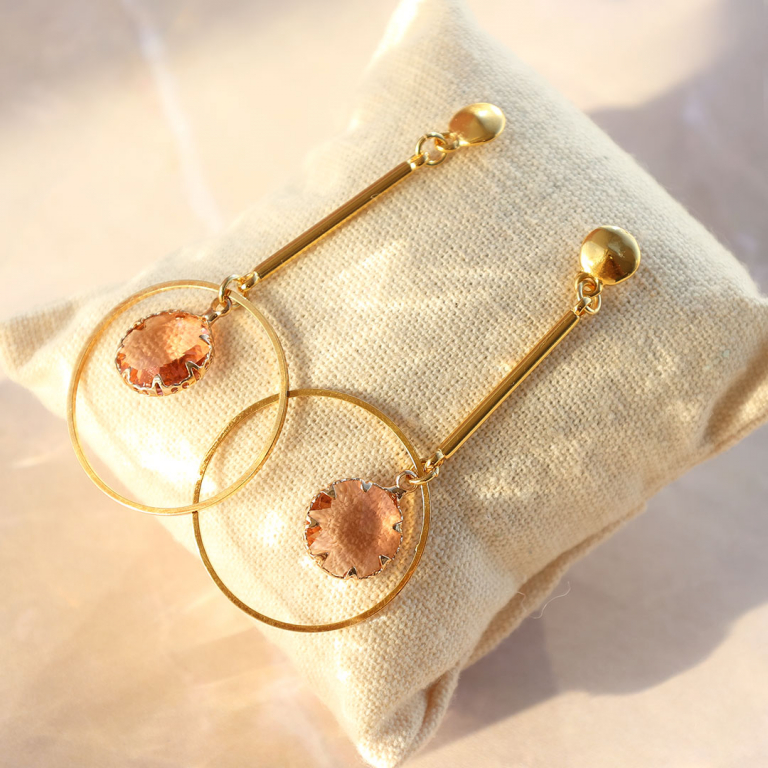 To design long earrings, you can combine the Crystal Glass charms with Crystal Glass connectors, a DQ metal spacer or a belcher chain. Use small freshwater pearls that you wrap around a closed ring with Artistic Wire. Wrap the Artistic Wire tightly around the ring a couple of times and thread one pearl onto the wire. Then wrap the wire around the ring twice before threading on the next pearl. Incorporate the ring in trendy earrings.