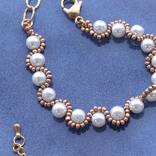 Are you also fond of glass pearls? Make a magnificent bracelet by stringing a beautiful big bead onto an eyepin and by creating a second eye on the other side. Create several of these connectors that you connect with jump rings. Attach smaller beads that you transformed into a charm using a headpin, onto the jump rings. Or create earrings with glass pearls in four different sizes, Miyuki beading wire and glass seed beads. You can use the same pattern to create a bracelet or a necklace by using glass pearls in one and the same size.