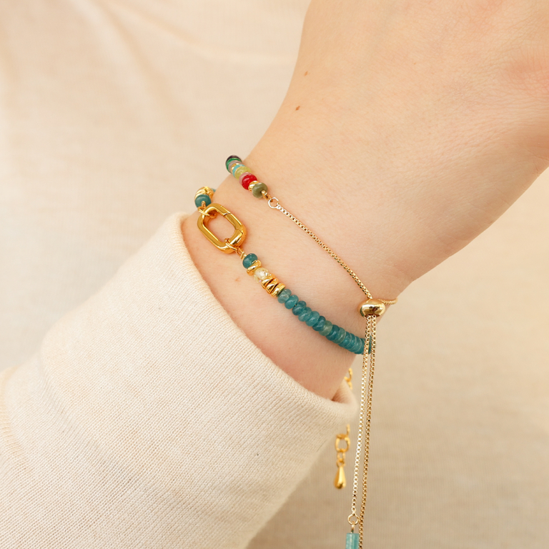 These natural stone beads in beautiful spring colours can be beautifully combined with various DQ metal beads from the collection. Design bracelets in which you alternate natural stone beads with freshwater pearls and zirconia beads, for example. Close the bracelet with a clasp and an extension chain. If you are using large tube beads, it is a good idea to thread this bead with a large hole over a smaller bead so that the tube bead stays in place.