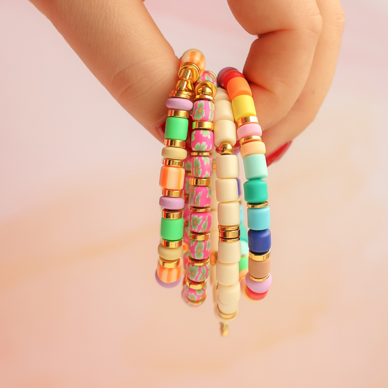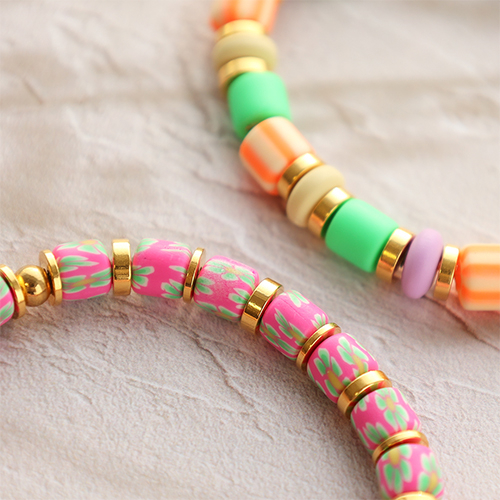 You can perfectly incorporate this series of polymer beads into a cheerful bracelet collection made with elastic thread. Alternate polymer beads with DQ metal rondelle disc beads for an extra elegant look. Incorporate various letter beads in the bracelets for a personal touch or hang charms on the bracelets. Finally, don't forget to reinforce the knot you use to close the bracelet with a drop of jewellery glue. Combine the polymer bracelets with bracelets made of belcher chain and bangle bracelets.
