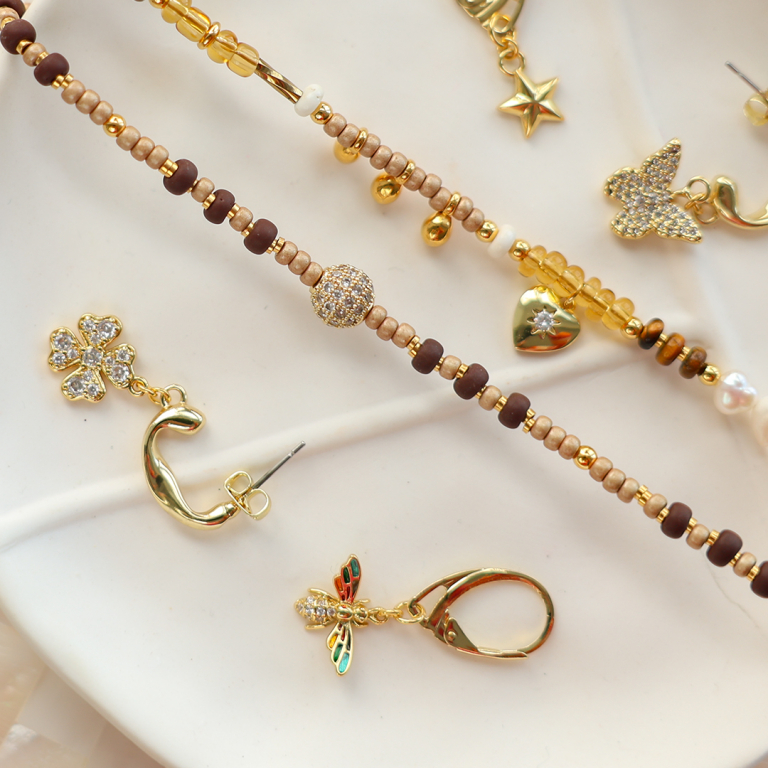 The new brass TQ metal collection includes beads and charms. The beads combine beautifully with freshwater pearls, natural stone beads and Miyuki seed beads to design elegant bracelets. Next to this, incorporate the charms and beads into trendy earrings.
