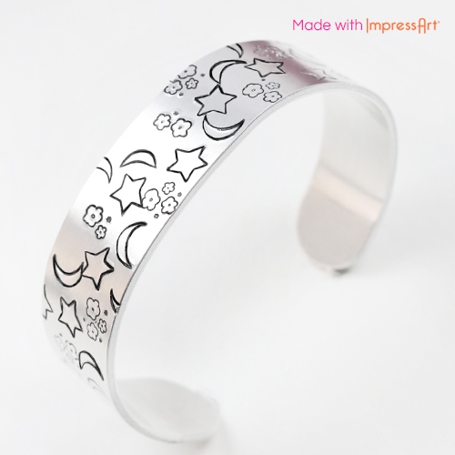 Make the most beautiful jewellery and accessories with ImpressArt Design Stamps. These design stamps are nice by itself, in combined with other design stamps or combined with letter and number stamps. Make a bangle bracelet for example, with various design stamps like stars, hearts and flowers. Or make a necklace with multiple layers. You can stamp a design on a small charm and texture on a bigger one. Place the small charm above the other one on a necklace, which creates a nice effect. You can also stamp designs onto Designer Quality leather for ImpressArt. This is a softer material than metal, so make sure you stamp less hard. Combine letter and design stamps for a playful look, like this ‘dream big’ necklace with moon and star stamps.