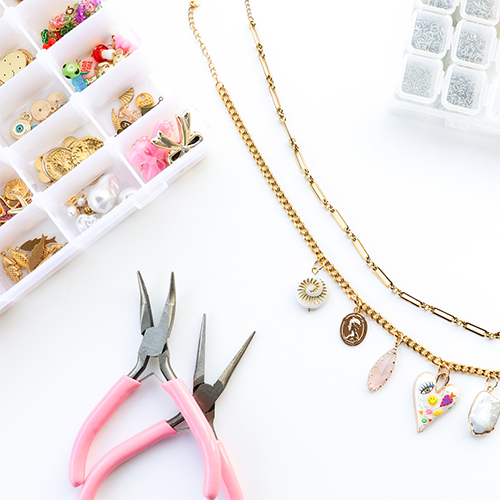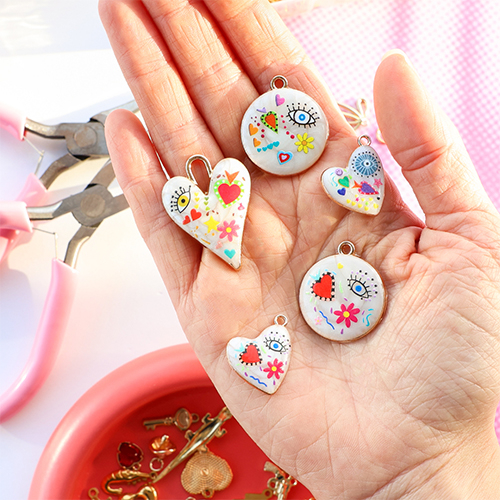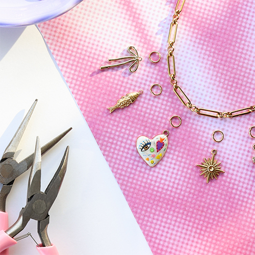 Create a funky charm necklace with metal charms with enamel