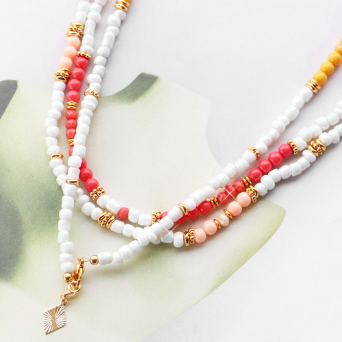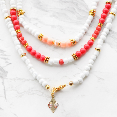 Making jewellery with glass beads is always a good idea! You will read how to get started right here. We’ve made trendy necklaces and bracelets with the opaque glass beads which matches together perfectly. The glass beads in this jewellery are combined with our favourite top faceted beads, glass seed beads and DQ European metal beads. This mix of different beads ensures the set of a playful look. As a finishing touch you can hang a brass TQ metal charm at the clasp, for example. A simple way to provide your jewellery with just that little bit extra. Good luck!