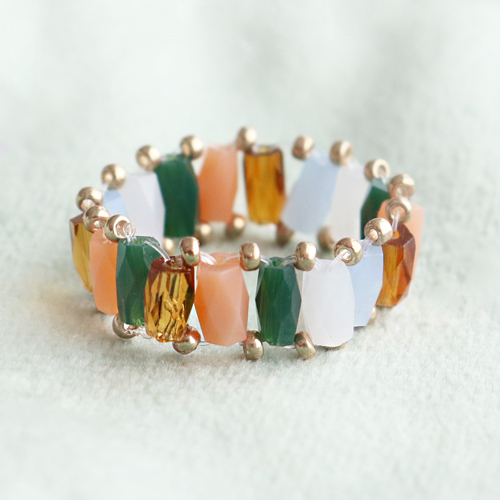 The top faceted tube beads are beads that you can use in any piece of jewellery. But this time we used them to make super cute rings. What do you need for this? These rings are made of Beadalon elastic cord 0.5mm and Beadalon Stringing Wire Supplemax 0.25mm. Cut a large piece of stringing material, about 10 cm (for one layer ring) to make it easy to knot the ring after threading. Now make a nice design with the beads. You can choose to combine the top facet tube beads with Miyuki beads. Thread the beads over the stringing material and close it with a number of knots on top of each other. To make it extra secure you can also put a drop of glue on the knot. Now it is your turn to make these fantastic rings yourself, good luck!