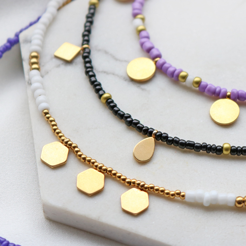 With the new stainless steel charms you can of course make all kinds of jewellery. But this time we have chosen to combine them in a necklace made of glass seed beads. To make these necklaces you thread seed beads for example in fun summer colours on metal wire. Between the glass seed beads you can then thread different stainless steel charms. This way you get a playful necklace with minimalistic details. These necklaces are also perfect to combine with each other and you can choose to wear several at once. By adding an extension chain to the clasp, you can always adjust the length of your necklace.