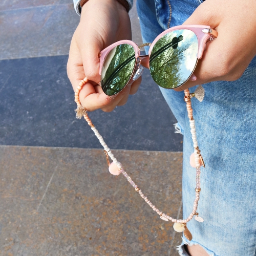 We are totally in love with these sunglasses from our sunglasses collection. Because you don't want to loose your sunglasses we decided to design some glasses cord ends. By creating your own design you can really yourself. Use a necklace of glass seed beads or the faux suede as a basis. Give shape to your design with DQ metal charms, pompom charms and bohemian pendants. Than you can personalize even further for a unique result. In the examples you can see some inspiration for light and dark designs that way you can always create the perfect glasses cord end matching your outfit!
