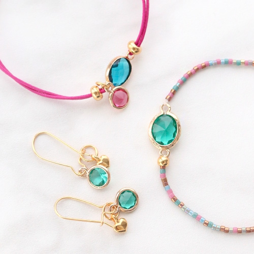 What kind of jewellery makes your customers happy? This jewellery with crystal glass is perfect for anyone! We combined crystal glass with multiple stringing materials like macramé bead cord and belcher chain. We also used our Miyuki delica beads in the latest trend colours, a cheerful detail in this arm-party. To finish the look we also designed matching earrings with earring findings of Designer Quality European metal.