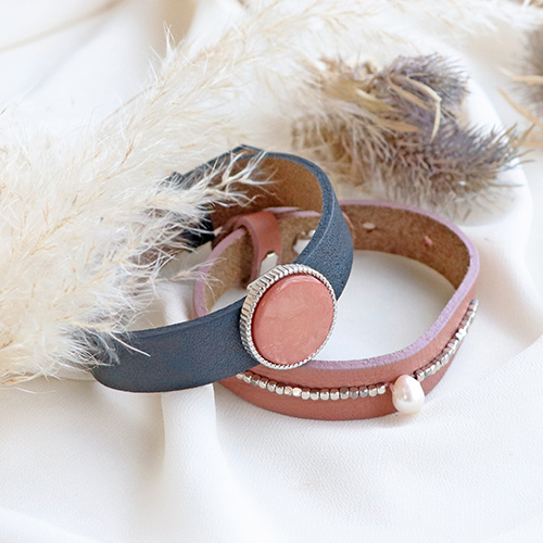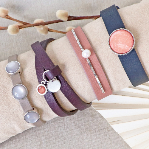 The most beautiful combinations with Cuoio bracelets are easily designed by you. To start off, choose your favorite width and length of the Cuoio bracelet. Then, you can style your bracelet. This will be done by choosing a cabochon of choice, which will be glued onto a matching setting. You can add one or more settings by easily shoving them onto the bracelet. Give your bracelet something extra by hanging charms on the loop. What about a DQ metal charm or a freshwater pearl? A real artist can also choose to decorate the bracelet by adding natural stone beads and flat freshwater pearls. These can be sewed on by hand. This way, the bracelet will be completely personalised. Mix and match your collection in your very own style!