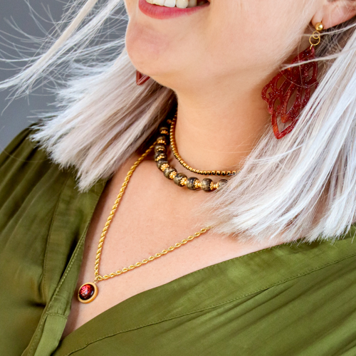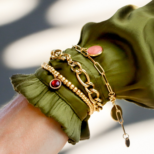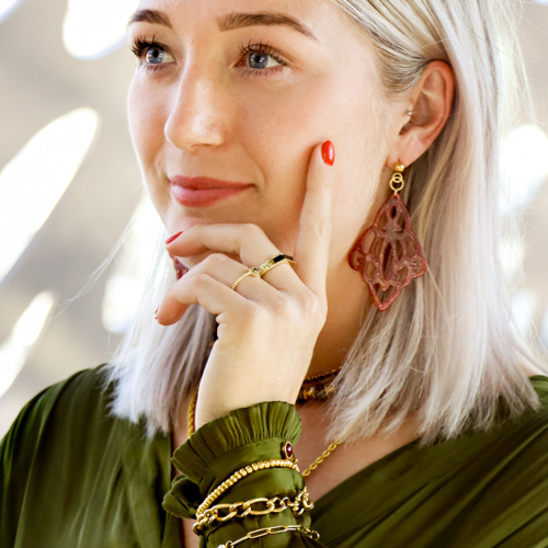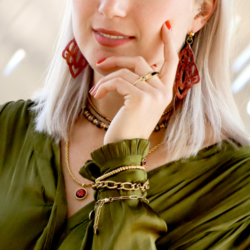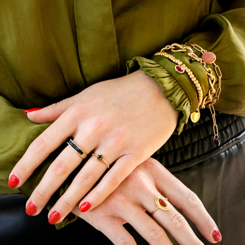 The sensual powerful trend is a mega powerful and feminin trend that includes real statement pieces. Think for instance about resin pendants, ceramic beads, chokers and bracelets to wrap around your sleeves. The use of statement rings also fits this trend perfectly.