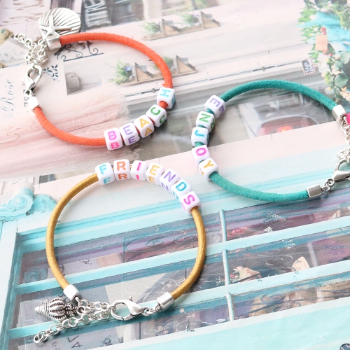 Design colourful summer jewellery with Designer Quality European leather and personalise them with our new letter beads! Bracelets with coloured DQ European leather and our square letter beads are very cheerful! These bracelets are very cute for those who love colour! A perfect gift!
